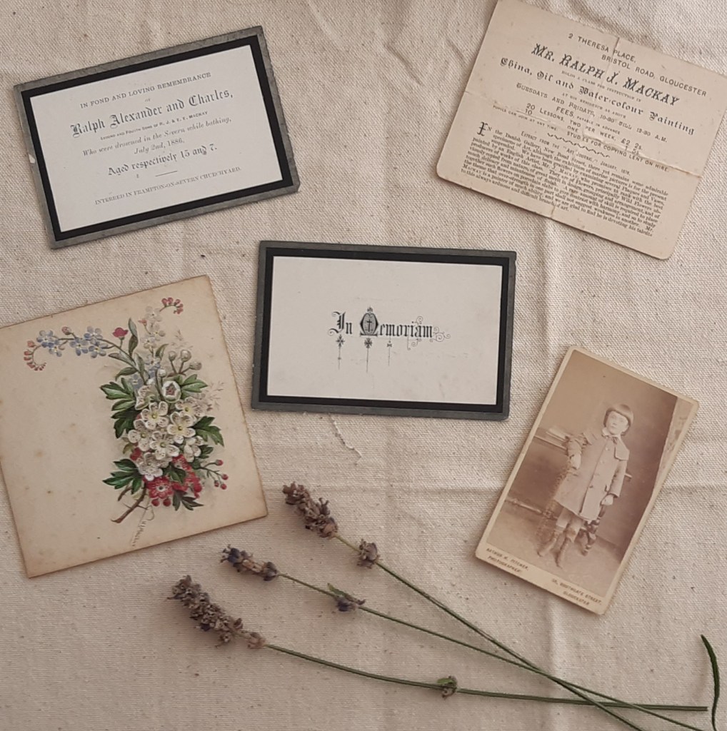 This untalked about family tragedy happened on my Mother-in-law’s side. Two little boys drowned in the River Severn in 1886, the sons of Ralph Mackay who painted Victorian Christmas card designs and other styles too, including the one pictured. One of the boys is on the right, identified by the writing on the back but I have yet to identify the other one. I believe all of the children are pictured but I try not to handle the photos too much.